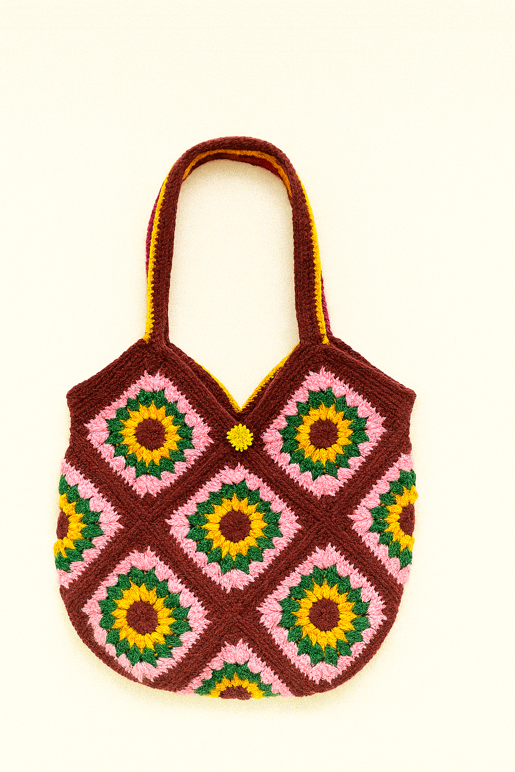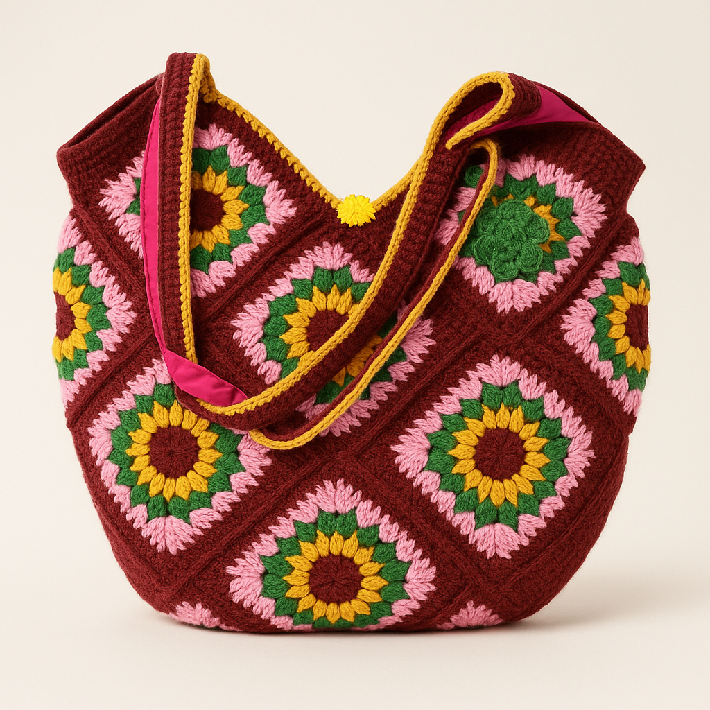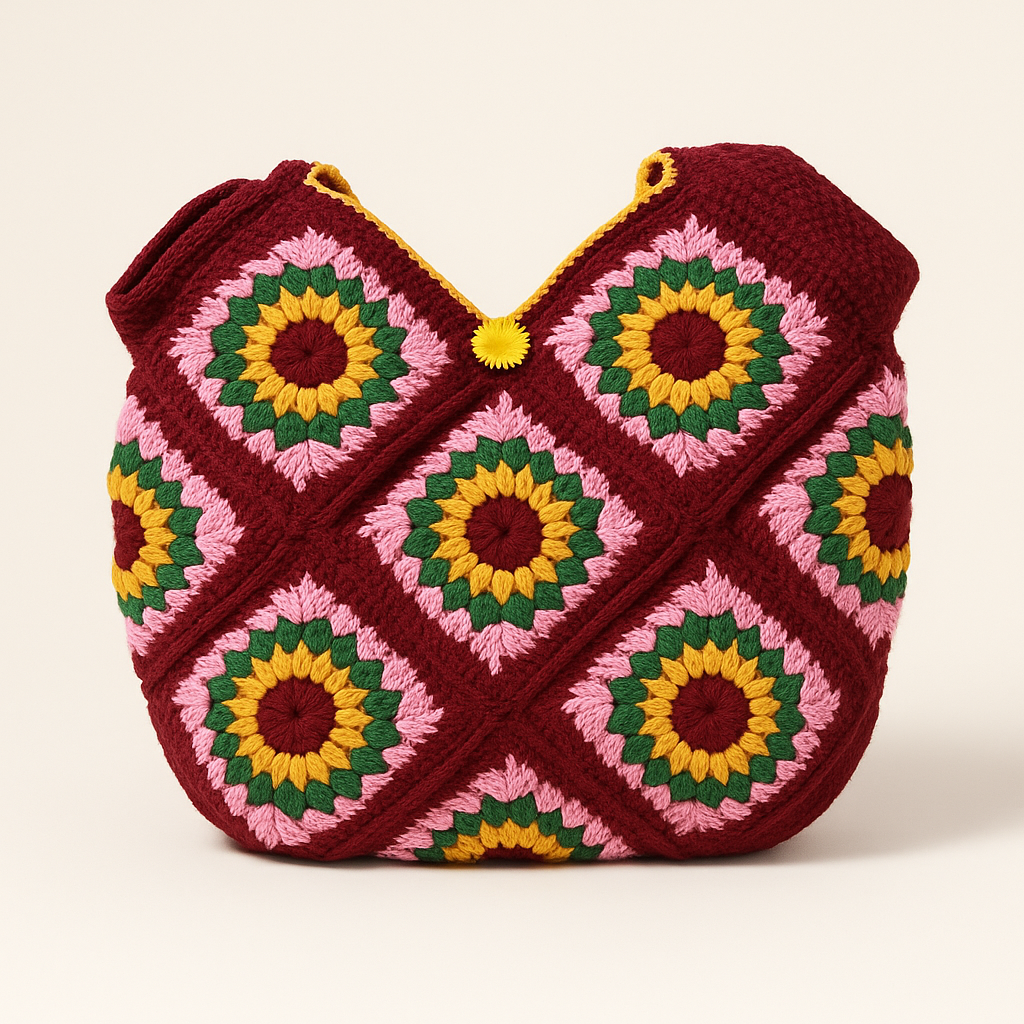 Medium-sized crochet bag with a secure button. Fits a 12” iPad or MacBook, journal, makeup, and daily essentials. Lightweight and easy to carry. Button Closure Bag