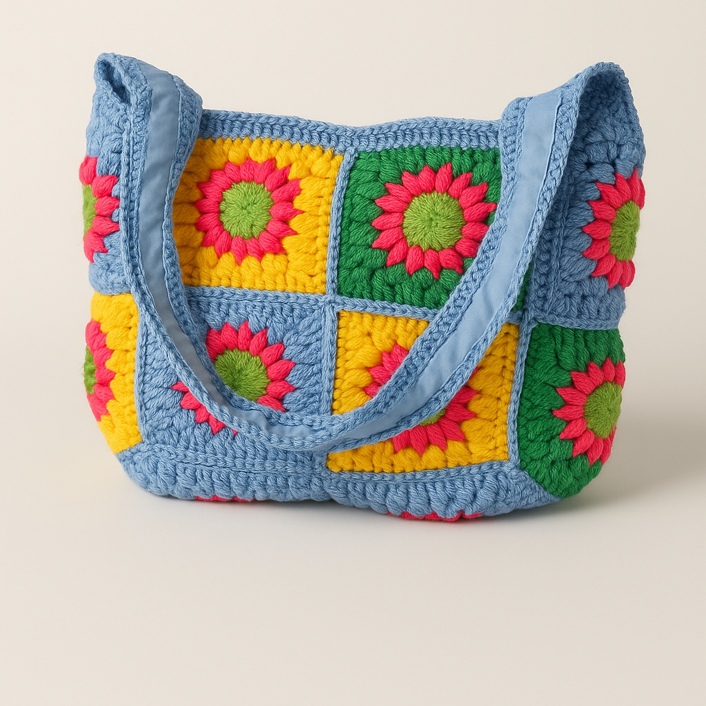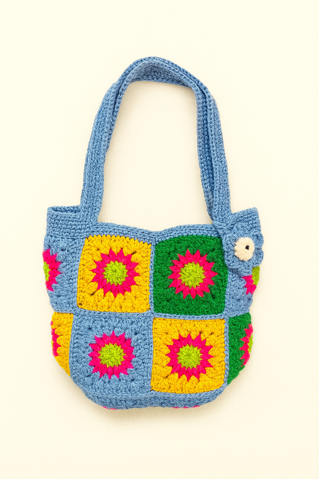 Medium-sized crochet bag with a secure button. Fits a 12” iPad or MacBook, journal, makeup, and daily essentials. Lightweight and easy to carry. Button Closure Bag